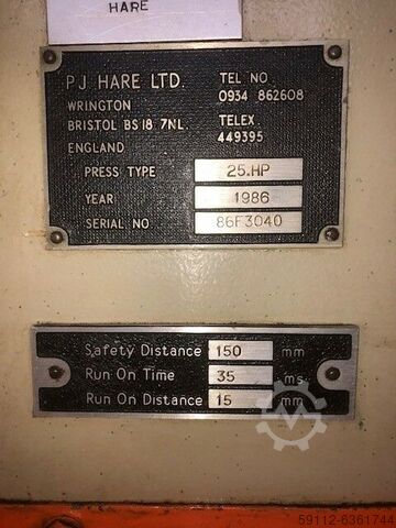 Pressa idraulica usata in vendita PJ Hare kft C frame: Pj Hare Limited pressa idraulica in vendita PRESS MODELLO: 25LE Altezza totale MM: 2425 Larghezza totale MM: 1120 Profondità totale MM: 1470 Peso KG: 2000 Parte del foro di serraggio. MM: 18 Interassi fori di fissaggio MM x MM: 610 x 1108 Dimensioni piastra di fissaggio MM x MM: 120 x 250 Capacità olio L: 50 Max. bar: 6 Pressione aria min. bar: 4 Potenza motore principale kw: 7,5 Fusibile motore A: 20 Completo di cuscino Alimentazione: Fusibile minimo A: 35 Dimensione minima del filo mm: 2,5 2. Altezza di chiusura: 200 Max. Luce diurna massima: 450 Regolazione dell'altezza della cerniera: 100 Profondità della gola: 250 Altezza del letto: 900 Larghezza del letto: 650 Profondità del letto: 480 Da fronte a centro: 250 Diametro di apertura 150 Spazio libero sotto il letto: 350/250 Dati di posizione della maglietta: 18, 15,34,33 Spessore del cuscinetto: 95 Larghezza della scanalatura laterale: - Larghezza della scanalatura verde: 255 Larghezza della scanalatura: 250 Altezza
